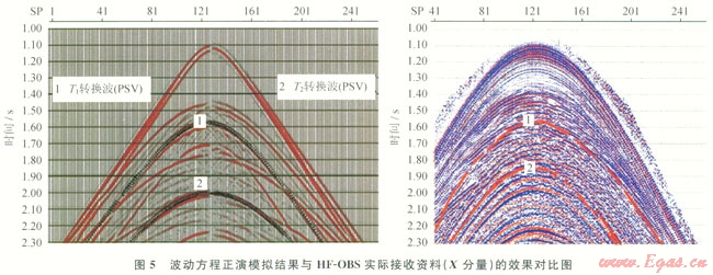 以南海北部陸坡地震測線A所對應的二維地震剖面作為波動正演模型的基礎,炮點位于模型中間的海面上,在海上和海底同時接收。圖5為波動方程正演模擬的結(jié)果與HF-OBS實際接收資料的效果對比圖。正演模擬結(jié)果可以幫助分析野外HF-OBS數(shù)據(jù)的接收效果,對野外采集具有較好的指導作用。