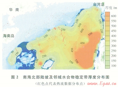 南海北部陸坡區(qū)水深變化范圍介于300~3500m之間,海底溫度介于1.45~9.00℃,而且與水深有很好的相關(guān)性。熱流分布較復(fù)雜(20~170mW/m2)。利用Miles[9]提出的海水中甲烷穩(wěn)定帶邊界曲線方程,以孔隙水鹽度為3.5%,氣體為純甲烷為約束條件,并根據(jù)熱流數(shù)據(jù)、熱導(dǎo)率、水深、海底溫度等參數(shù)進(jìn)行了穩(wěn)定帶厚度估算。計算結(jié)果表明,南海北部陸坡水合物穩(wěn)定帶厚度介于0~350m,在水深較大海盆區(qū)可超過500m(圖2),在水深小于500m的區(qū)域基本不具備形成水合物的條件。穩(wěn)定域厚度與水深變化呈正相關(guān)關(guān)系,而且水合物穩(wěn)定域受熱流變化驅(qū)動明顯,穩(wěn)定域厚度的變化梯度與熱流值變化梯度有很大相關(guān)性,熱流值變小的地方穩(wěn)定域厚度變?nèi)?,呈?fù)相關(guān)關(guān)系。