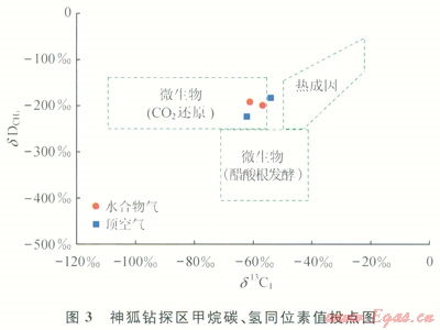 天然氣水合物氣體成因、來源及供給潛力是水合物成藏研究的最基本問題,它決定著水合物形成的物質(zhì)基礎(chǔ)及礦藏的資源潛力。深部的熱成因氣以及由水合物穩(wěn)定帶下部向上運(yùn)移的生物氣對于形成水合物是必需的[10],不同成因類型的烴類氣體具有不同的形成機(jī)理和運(yùn)聚方式,并影響水合物的成藏和分布。目前世界各地發(fā)現(xiàn)的水合物大多數(shù)由微生物氣生成,僅墨西哥灣、黑海、麥肯齊三角洲等地區(qū)的水合物是由熱解氣或混合氣生成的。因此,生物成因氣在水合物成藏研究中得到了較大的關(guān)注。由于頂空氣代表充填在沉積物孔隙或裂隙中的游離氣,與水合物礦藏氣體的成因關(guān)系密切,近年對南海北部陸坡大量淺表層沉積物(海底以下0~10m)中頂空氣的測試分析結(jié)果表明,頂空氣中的d13C1值介于-102.6‰~-24.0‰,平均值為-71.1‰,C1/(C2+C3)值介于6~84659,dD值介于-180‰~145‰,研究表明氣體來源具有多源性,而且在不同區(qū)域有所差別。東沙海域頂空氣的d13C1值為-102.6‰~-38.2‰,平均值為-78.5‰,是以微生物氣為主的混合氣;西沙海域頂空氣d13C1值為-94.2‰~-71.4‰,平均值為-85.5‰,為微生物氣。從神狐鉆探區(qū)情況看,水合物樣品中的烴類氣體以甲烷為主,甲烷含量高達(dá)99.89%和99.91%,C1/(C2+C3)值分別為911.7和1094,d13C1值為-56.7‰和-60.9‰,dD值為-199﹪和-180‰;2個頂空氣樣品的甲烷含量分別達(dá)99.92%和99.96%,C1/(C2+C1)值分別為1373.5和2447,d13C1值為-62.2‰和-54.1‰,dD值為-225‰和-191‰。神狐鉆探區(qū)呈現(xiàn)以微生物氣為主的混合氣特征[11-12],根據(jù)甲烷碳、氫同位素特征分析,主要為C0。還原型甲烷(圖3),水合物具有自生自儲原地附近運(yùn)聚的成藏特征[13]。