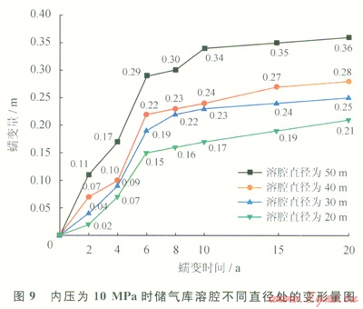 根據(jù)模擬計(jì)算所得結(jié)果,可以得到不同壓力下儲(chǔ)氣庫溶腔不同直徑處變形量圖(圖9~11),經(jīng)總結(jié)分析,僅列出具有代表性的分析圖。圖9~11分別表示溶腔內(nèi)壓為10MPa、20MPa、30MPa時(shí),不同蠕變時(shí)間鹽穴儲(chǔ)氣庫溶腔不同直徑處的變形量。