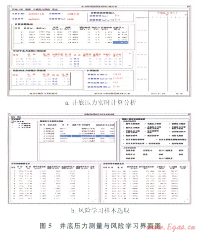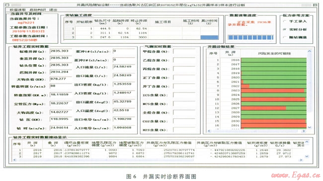 在我國某油田鉆井時(shí),應(yīng)用鉆井風(fēng)險(xiǎn)控制系統(tǒng)實(shí)時(shí)診斷鉆井狀態(tài),分別對鉆井實(shí)時(shí)數(shù)據(jù)采集軟件、鉆井實(shí)時(shí)數(shù)據(jù)庫管理軟件、鉆井風(fēng)險(xiǎn)因素實(shí)時(shí)計(jì)算分析軟件和鉆井風(fēng)險(xiǎn)推理風(fēng)險(xiǎn)軟件進(jìn)行現(xiàn)場測試(5、6)。以采集的鉆井實(shí)時(shí)數(shù)據(jù)為基礎(chǔ),應(yīng)用鉆井風(fēng)險(xiǎn)因素實(shí)時(shí)分析軟件計(jì)算井底壓力和地層壓力等參數(shù),以鄰井資料作為井漏風(fēng)險(xiǎn)學(xué)習(xí)的樣本,判斷該井井漏風(fēng)險(xiǎn),系統(tǒng)判斷該井在鉆至2823m時(shí)井漏風(fēng)險(xiǎn)可能性較大,當(dāng)鉆進(jìn)至2825m時(shí)技術(shù)人員發(fā)現(xiàn)井底發(fā)生漏失,決定進(jìn)行起鉆堵漏作業(yè)。現(xiàn)場測試表明鉆井風(fēng)險(xiǎn)控制系統(tǒng)的數(shù)據(jù)采集軟件與儀器測量儀器同步性好,數(shù)據(jù)庫設(shè)計(jì)合理,且井漏風(fēng)險(xiǎn)實(shí)時(shí)診斷預(yù)測結(jié)果與現(xiàn)場完全吻合。