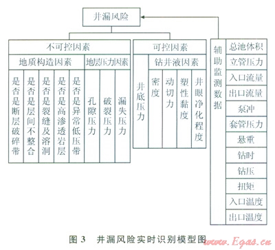 4)在研究風(fēng)險(xiǎn)推理分析理論基礎(chǔ)上建立了兩種適合于鉆井風(fēng)險(xiǎn)工程應(yīng)用的風(fēng)險(xiǎn)評估方法——基于層次分析法的模糊綜合評價(jià)法和BP神經(jīng)網(wǎng)絡(luò)識別法。這兩種方法都是將鉆井風(fēng)險(xiǎn)因素實(shí)時(shí)分析和數(shù)學(xué)推理相結(jié)合的鉆井風(fēng)險(xiǎn)評估方法,確保了鉆井風(fēng)險(xiǎn)識別分析的實(shí)時(shí)性。完成了井漏、地層流體侵入[16-17]、井塌和卡鉆的發(fā)生機(jī)理研究,總結(jié)了這4種風(fēng)險(xiǎn)發(fā)生時(shí)的表征現(xiàn)象及規(guī)律,確定了風(fēng)險(xiǎn)因素邏輯關(guān)系,并建立了其風(fēng)險(xiǎn)實(shí)時(shí)識別模型,結(jié)合鉆井風(fēng)險(xiǎn)評估方法,構(gòu)建了風(fēng)險(xiǎn)模糊綜合評價(jià)識別模型和BP神經(jīng)網(wǎng)絡(luò)識別模型。圖3為井漏風(fēng)險(xiǎn)的實(shí)時(shí)識別模型。