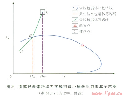 目前古流體壓力值測(cè)定方法有多種[8-18],筆者結(jié)合本地區(qū)油氣成藏的地質(zhì)條件,采用流體包裹體PVT模擬法來(lái)計(jì)算古流體壓力值。如圖3中,ABC線為烴類(lèi)包裹體或含烴鹽水包裹體等容線,AB段為氣液兩相共存,到B點(diǎn)均一為液相;ThB為含烴鹽水或烴類(lèi)流體包裹體均一溫度,ThC為同期鹽水包裹體均一溫度。