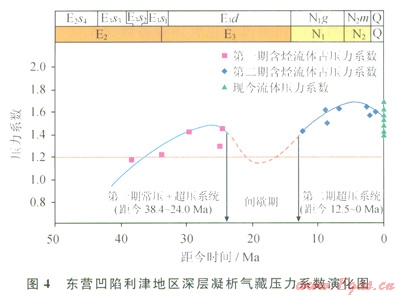 利津地區(qū)凝析氣藏古壓力系數(shù)隨時(shí)間演化的關(guān)系表明(圖4):