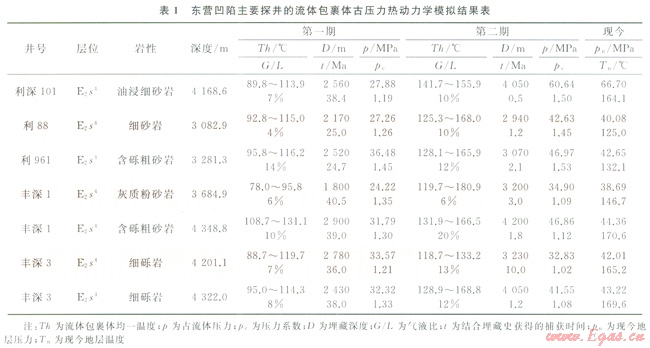將各期次鹽水包裹體的均一溫度及其共生的同期含烴鹽水包裹體或烴類(lèi)包裹體的均一溫度、氣/液比和化學(xué)組成輸入VTFLINC軟件,即可獲得熱動(dòng)力學(xué)模擬結(jié)果——各期次流體包裹體的最小捕獲壓力和壓力系數(shù)。利用東營(yíng)凹陷北帶利津、民豐等地區(qū)所采集樣品獲得“數(shù)據(jù)對(duì)”的樣品開(kāi)展了熱動(dòng)力學(xué)模擬,模擬得到了主要探井的部分古流體壓力(表1)。