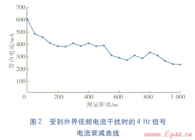 一般情況下,管道內(nèi)的信號電流應(yīng)該隨著測量距離的增大而不斷衰減,但是當(dāng)存在外界低頻電流干擾時,4Hz的信號電流會出現(xiàn)突然反彈或者波動的現(xiàn)象,受到外界低頻電流干擾時的4Hz信號電流衰減曲線見圖2[6]。外界干擾的低頻電流會與檢測中使用的4Hz低頻信號電流互相作用,產(chǎn)生疊加或抵消,當(dāng)疊加時,會出現(xiàn)圖2中信號電流反彈升高的情況;當(dāng)?shù)窒麜r,會出現(xiàn)信號電流驟然變小的情況。無論是疊加還是抵消,都會對防腐層的檢測結(jié)果產(chǎn)生很大影響,甚至嚴(yán)重失真。