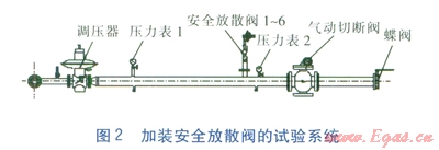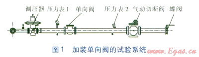 當(dāng)用戶用氣設(shè)備突然停機(jī),會造成調(diào)壓器出口管段內(nèi)壓力瞬間升高,其原因主要是用氣設(shè)備的切斷速度極快(切斷時間小于1s),而調(diào)壓器的閥口關(guān)閉速度慢(需3~4s),調(diào)壓器閥口關(guān)閉的響應(yīng)時間比用戶用氣設(shè)備切斷閥的切斷時間長,造成用戶用氣設(shè)備切斷后,調(diào)壓器上游還有少量氣體輸送至下游,造成下游管段壓力瞬間升高。如何抑制調(diào)壓器出口壓力的突然上升?本文從在調(diào)壓器出口管段上加裝單向閥、加裝安全放散閥以及調(diào)整用戶端用氣設(shè)備控制閥門的關(guān)閉程序等3個方面進(jìn)行試驗(yàn)研究。