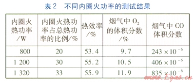 在燃燒器直徑一定的情況下,適當(dāng)增大內(nèi)圈火熱功率也可實現(xiàn)熱效率的提升。以我公司某款不帶二次空氣獨立流動通道的嵌入式燃?xì)庠顬槔紵鳠峁β蕿?span lang="EN-US">4.0kW,內(nèi)圈火熱功率所占比例為20%,即0.8kW。在試驗過程中,不斷增大內(nèi)圈火熱功率所占的比例,由20%逐步提高至30%,其熱效率逐漸增高。但增大到一定比例時,其煙氣中CO含量翻倍增長,熱效率增加減緩。不同內(nèi)圈火熱功率的測試結(jié)果見表2,具體數(shù)值變化情況與燃燒器結(jié)構(gòu)設(shè)計有直接關(guān)系,因此內(nèi)圈火熱功率應(yīng)針對具體的燃?xì)庠钸M(jìn)行試驗確定。