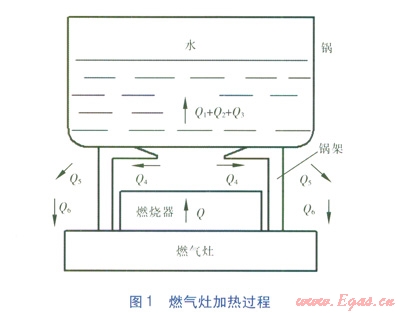家用燃?xì)庠顭嵝适窃跇?biāo)準(zhǔn)試驗條件下,有效利用的熱量在燃?xì)馊紵尫趴偀崃恐兴嫉谋壤?,即燃?xì)饽茉吹睦寐?,是衡量家用燃?xì)庠钍欠窆?jié)能的關(guān)鍵指標(biāo)。我們以GB164102007《家用燃?xì)庠罹摺芬?guī)定的標(biāo)準(zhǔn)試驗條件下的燃?xì)庠詈驮囼炗缅佔鳛檠芯繉ο?,分析燃?xì)庠畹募訜徇^程(見圖1)
