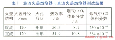 經(jīng)過整機(jī)測試,與傳統(tǒng)的直流火蓋燃燒器對比,旋流火蓋燃燒器比傳統(tǒng)直流火蓋燃燒器燃燒更均勻穩(wěn)定,熱效率高4(絕對值)以上,煙氣中CO含量更低。測試結(jié)果見表1。