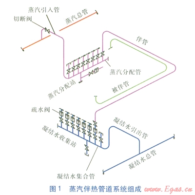 蒸汽伴熱系統(tǒng)組成見圖1,主要包括:蒸汽總管,蒸汽引入管,蒸汽分配站,伴管,被伴管,凝結(jié)水收集站,凝結(jié)水引出管,凝結(jié)水總管等[3]