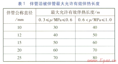 伴管沿被伴管的最大允許有效伴熱長度按表1確定,表1p為蒸汽壓力。