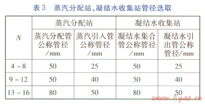 《規(guī)范》規(guī)定,先計算蒸汽分配站、凝結(jié)水收集站各種管徑伴管總根數(shù)(應(yīng)包括備用接頭管徑對應(yīng)的根數(shù))N,然后根據(jù)表3選取蒸汽分配管、蒸汽引入管、凝結(jié)水集合管、凝結(jié)水引出管公稱直徑。當N超過16時,宜設(shè)立兩座或兩座以上蒸汽分配站、凝結(jié)水收集站。N的計算式為: