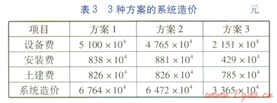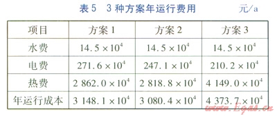 3種方案年運行費用見表5。水價按2元/t計算,電價按0.3707/(kW·h)計算,蒸汽熱價按18元/GJ計算。由表3可知,方案1的系統(tǒng)造價最高,其次為方案2,方案3的系統(tǒng)造價最低。由表5可知,方案2的年運行費用最低,其次為方案1,方案3的年運行費用最高。將方案3作為對比方案,方案1、2高出的系統(tǒng)造價,分別在2.82.4a時可以收回。考慮年運行費用,方案12的整體經(jīng)濟性優(yōu)于方案3,且方案12的差距不大。