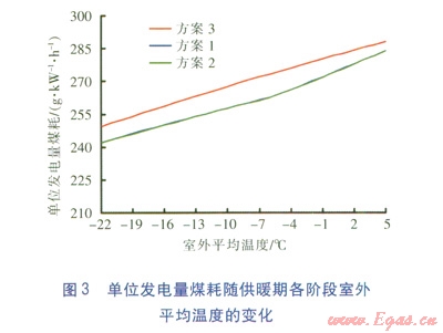 供暖期按180d計算,供熱系統(tǒng)采用分階段改變流量的質(zhì)調(diào)節(jié)方式。單位發(fā)電量煤耗(發(fā)電煤耗為總煤耗扣除發(fā)電機組汽輪機抽汽熱量折算煤耗、熱泵機組回收的小汽輪機排汽余熱折算煤耗、發(fā)電機組汽輪機乏汽余熱折算煤耗)隨供暖期各階段室外平均溫度的變化見圖3。由圖3可知,由于方案1、2利用了工藝余熱,單位發(fā)電量煤耗明顯小于方案3。方案12的單位發(fā)電量煤耗非常接近,由于乏汽余熱品質(zhì)略高于小汽輪機凝汽器冷卻水,因此方案2的單位發(fā)電量煤耗略低于方案1。