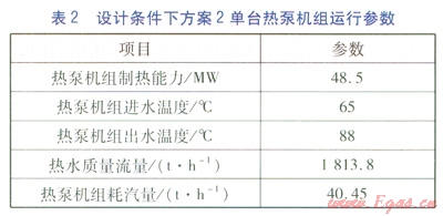 由于熱泵機組低溫?zé)嵩礊榉ζ瑹岜脵C房宜設(shè)置在空冷島附近,且機房占地面積不宜過大,選擇2臺制熱能力為48.5MW的熱泵機組,3臺換熱能力為45MW的汽—水換熱器。方案2的運行策略與方案1一致,設(shè)計條件下(室外溫度為-22℃),方案2單臺熱泵機組運行參數(shù)見表2。