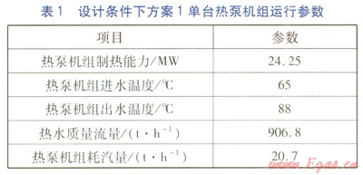 方案1的運行策略為:初末寒期采用熱泵機組單獨供熱,汽—水換熱器不啟動,當(dāng)熱泵機組出水溫度不能滿足要求時,啟動汽—水換熱器對熱泵機組出水進(jìn)行加熱。配置4臺制熱能力為24.25MW的熱泵機組,3臺換熱能力為45MW的汽—水換熱器。設(shè)計條件下(室外溫度為-22℃),方案1單臺熱泵機組運行參數(shù)見表1。