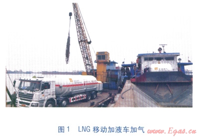對于采用瓶組式LNG儲氣系統(tǒng)的改裝船,可以將提前充裝好的備用瓶組運至碼頭,每只容積500L的鋼瓶充液后質(zhì)量約700kg,加氣時改裝船??吭诖a頭,用簡易吊裝設備即能吊換LNG瓶組。如遇枯水期船舶無法靠岸,也可用小船運輸LNG瓶組至改裝船進行吊換。應急加氣方式經(jīng)濟實用,對碼頭的要求低,適用于船舶油改氣項目初期試點階段。