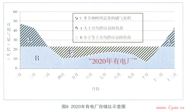 用以上方法計算得到:對于第一種情況“2020年有電廠”,平衡一年中各月不均勻用氣所需的儲氣量為70億m3;第二種情況“2020年無電廠,”季節(jié)調(diào)峰理論儲氣量53億m3。