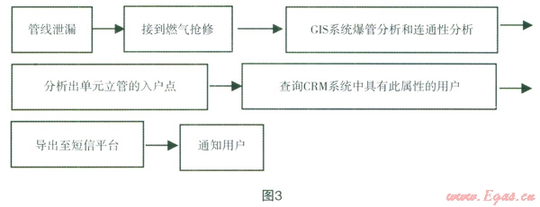 GIS系統(tǒng)中,設(shè)置單元立管的入戶點(diǎn)為最小單元;在CRM系統(tǒng)中,增加燃?xì)庥脩羲鶎賳卧⒐苋霊酎c(diǎn)的屬性;當(dāng)出現(xiàn)燃?xì)夤艿佬孤屝迒栴}時(shí),可以通過GIS系統(tǒng)中的爆管分析和連通性分析,分析出泄漏點(diǎn)所影響的單元立管入戶點(diǎn),通過調(diào)用CRM系統(tǒng)中的具有此入戶點(diǎn)屬性的用戶,分析出所影響的用戶數(shù),并調(diào)用短信平臺(tái)接口將停氣通知實(shí)時(shí)發(fā)送至用戶手機(jī)中。此種方式,提高了影響范圍用戶的準(zhǔn)確性,并縮短了通知用戶的時(shí)間。具體的過程如圖3