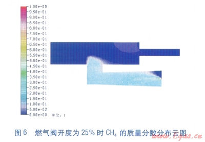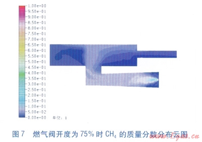 圖6、7為沿爐腔排氣導(dǎo)管軸線縱截面(即y=0平面)內(nèi)CH4的質(zhì)量分?jǐn)?shù)分布云圖,單位為l。當(dāng)燃?xì)忾y開度為25%時(shí),燃?xì)鈬娚渌俣容^低,引射管內(nèi)CH4的質(zhì)量分?jǐn)?shù)較大,說(shuō)明燃?xì)獾靡栽谝涔軆?nèi)和空氣預(yù)混充分,然后進(jìn)入爐腔內(nèi)點(diǎn)火燃燒。當(dāng)燃?xì)忾y開度為75%時(shí),燃?xì)鈬娚渌俣容^高,引射管內(nèi)CH4的質(zhì)量分?jǐn)?shù)比燃?xì)忾y開度為25%狀態(tài)低了很多。