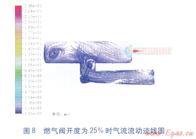 利用FLUENT軟件對(duì)比模擬了燃?xì)忾y開度為25%和75%兩種條件下?tīng)t腔內(nèi)的氣體流動(dòng)狀態(tài)。計(jì)算得出兩種狀態(tài)下整個(gè)爐腔內(nèi)氣流的最高流速分別為24.61m/s和46.86m/s。高速流主要出現(xiàn)在爐腔排氣導(dǎo)管。