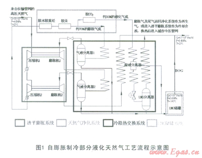 (2)自膨脹制冷部分液化天然氣工藝流程主要包括:原料天然氣的過濾、計(jì)量及加壓,原料天然氣的凈化,30%凈化天然氣的液化,70%膨脹氣流的制冷;主要設(shè)備系統(tǒng)則包括:天然氣凈化系統(tǒng),透平膨脹系統(tǒng),冷箱熱交換系統(tǒng),以及LNG儲罐系統(tǒng)。