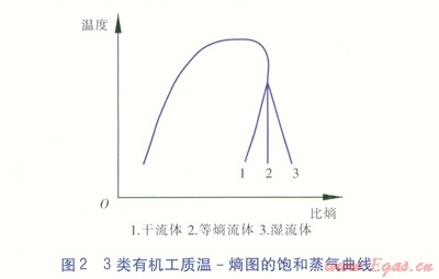 有機工質(zhì)對有機朗循環(huán)發(fā)電系統(tǒng)的性能影響較大。有機工質(zhì)可根據(jù)溫-熵圖飽和節(jié)氣曲線的右半部分的斜率分3(見圖2):第一類:斜率為負的濕流體,這些流體的等熵膨脹易產(chǎn)生凝結(jié)現(xiàn)象,在透平內(nèi)膨脹做功后凝結(jié),易對透平造成危害。第二類:斜率為正的干流體。第三類:近似垂直的等熵流體。干流體與等熵流體可避免濕流體造成的危害,另外還應(yīng)要考慮有機工質(zhì)的熱力學(xué)性能和環(huán)保特性。