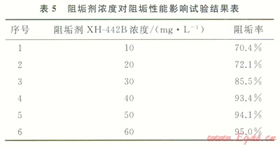 測(cè)試條件:試驗(yàn)溫度70℃,恒溫24h,試驗(yàn)水樣為現(xiàn)場(chǎng)所取白馬8井混合水樣。實(shí)驗(yàn)結(jié)果表明:當(dāng)阻垢劑XH-442B濃度等于或大于40mg/L時(shí)阻垢率達(dá)到93%以上,取得較好的阻垢效果(表5)。