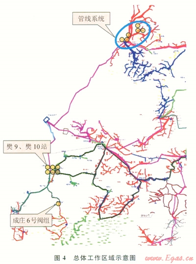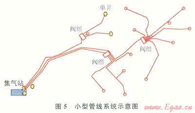 區(qū)塊內(nèi)小型管線系統(tǒng)如圖5所示,共5個(gè)測(cè)試點(diǎn)(以黃色圓形表示):華固18-2(單井產(chǎn)氣量為516m3d)、華固18-3(單井產(chǎn)氣量為2774m3d)、樊4集氣站的18號(hào)閥組采氣干線、樊4站進(jìn)口匯管、樊4站出口。