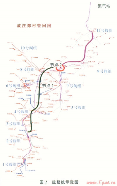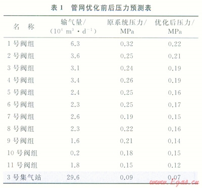 由以上計算可知,在2號閥組經(jīng)3號閥組、4號閥組、節(jié)點l、節(jié)點29號閥組至ll號閥組新建一條采氣干線作為復(fù)線,該復(fù)線建設(shè)后,管網(wǎng)起點1號閥組壓力進行對比,壓力將從0.32MPa降低至0.22MPa,終端3號站進站壓力可從0.09MPa降至0.07MPa,系統(tǒng)運行壓力不均衡狀況得到大大的緩解。