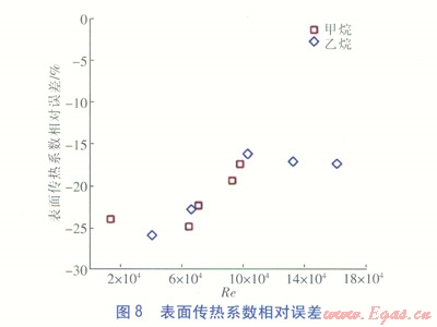 從圖5和圖6可看出,殼側制冷劑過熱態(tài)流動時摩擦壓力降梯度、表面?zhèn)鳠嵯禂?shù)均與雷諾數(shù)呈同向變化,摩擦壓力降梯度變化范圍較大,表面?zhèn)鳠嵯禂?shù)基本在200~1000W/(m2·K)。從圖7和圖8可看出,無論是甲烷還是乙烷,摩擦壓力降梯度相對誤差和表面?zhèn)鳠嵯禂?shù)相對誤差基本都控制在-25%~-15%范圍內(nèi),并且表面?zhèn)鳠嵯禂?shù)相對誤差隨著雷諾數(shù)增大而變小。由于殼側模型幾何形狀復雜,流道間隙細小,所以在不修正湍流模型的情況下數(shù)值計算相對誤差尚可。