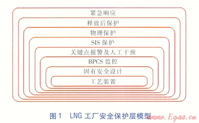 LNG工廠由于物料的易燃易爆特性、產(chǎn)品的低溫深冷特性以及低溫帶來(lái)的某些工藝條件的苛刻性決定了其安全的重要性。安全儀表系統(tǒng)(Saletv Instrumented System,簡(jiǎn)稱(chēng)SIS)是通過(guò)儀表和自動(dòng)化技術(shù)實(shí)現(xiàn)安全的一種措施,近幾年在我國(guó)已建的LNG工廠中廣泛使用,對(duì)LNG工廠的安全生產(chǎn)起到了一定的保證作用。但也應(yīng)注意到,從業(yè)者普遍過(guò)分依賴(lài)SIS,忽視了其他技術(shù)安全相關(guān)系統(tǒng)(也稱(chēng)其他技術(shù)保護(hù)層),造成的結(jié)果一是SIS的動(dòng)作率偏高,導(dǎo)致停車(chē)頻繁,工廠經(jīng)濟(jì)性受到損害;二是裝置的安全保護(hù)層不完善,過(guò)程安全存在一定的隱患。