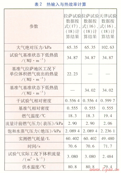 GB 25034中的熱流量計算公式見式(16),是將實測熱流量折算到海平面地區(qū)的標(biāo)準(zhǔn)狀態(tài)(15℃,101.3kPa)下的熱流量。,但我們此次試驗的目的是要測出燃氣采暖熱水爐在拉薩地區(qū)工況(15℃,66.2kPa)下的熱流量。將式(16)中101.3kPa替換為拉薩地區(qū)的大氣絕對壓力66.2kPa,將15℃、101.3kPa基準(zhǔn)氣低熱值替換為15℃、66.2kPa下單位體積基準(zhǔn)氣放出的熱量(取值為22.23MJ/m3),計算折算到拉薩地區(qū)工況下的熱流量,見式(17)。計算熱效率見式(18)。