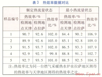 表3列出了5臺樣機分別在拉薩地區(qū)及天津地區(qū)測得的額定熱流量與最小熱流量狀態(tài)的熱效率對比數(shù)據(jù)。