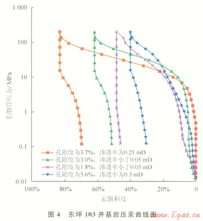 基巖儲層屬于雙重介質(zhì),29個巖樣的物性分析結(jié)果表明:基質(zhì)孔隙度介于1.2%~7.2%,平均為3.4%;滲透率介于0.054~0.91mD,平均為0.19mD,儲層致密。壓汞實驗結(jié)果表明:基質(zhì)排驅(qū)壓力在7MPa以上,部分樣品推測受裂縫影響,沒有平直段,排驅(qū)壓力較低(圖4);進汞飽和度介于30%~80%。目前僅有4塊壓汞實驗樣品,實驗結(jié)果差異較大,也反映了基巖微觀非均質(zhì)性較強,其礦物溶孔和裂縫的分布差異較大。