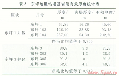 對于基巖塊狀氣藏,根據(jù)現(xiàn)有井測井響應特征和取心資料,可以初步劃分出基巖井段內(nèi)的致密夾層,算出基巖段內(nèi)儲集層的有效厚度(表3)。