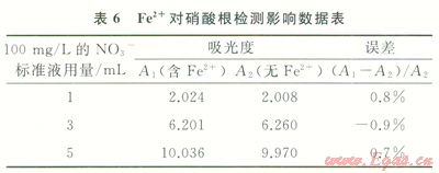 50mL容量瓶中配制不同濃度NO3-標(biāo)準(zhǔn)溶液,一組加入1mL100mgL Fe2+標(biāo)準(zhǔn)液作對照,測得的NO3-吸光度如表6所示。