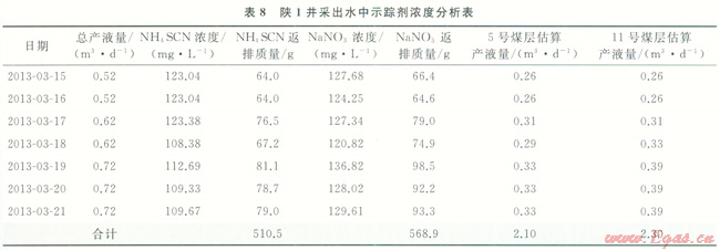 201212月對陜1井進(jìn)行了分層壓裂施工,11號煤壓裂注入壓裂液1153m3,加入NaNO3 500kg,示蹤劑NaNO3在單層壓裂液中的平均濃度約為430mgL5號煤壓裂,注入壓裂液1135m3,加入NH4SCN 500kg,示蹤劑NH4SCN在單層壓裂液中的平均濃度約為440mgL。壓裂施工完成后,于2013310日開始進(jìn)行排采,2013315日開始連續(xù)一周每天取樣進(jìn)行室內(nèi)檢測,按照前面實(shí)驗(yàn)室分析方法分析SCN-NO3-測得采出水中兩種示蹤劑的含量如表8所示。