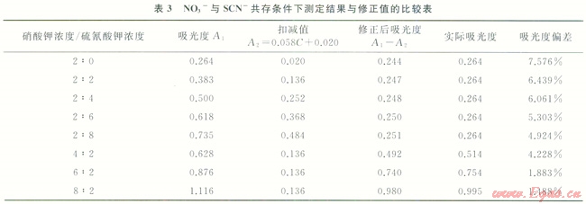 由表3可知,NO3-吸光度經(jīng)修正后,總體偏低,但誤差可控制在7.576%范圍內(nèi)。該修正方法降低了SCN-NO3-測量的影響。