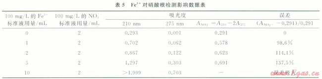 由表5結(jié)果表明:不加Fe3+時(shí),NO3-標(biāo)準(zhǔn)液因不含有機(jī)物,在275nm處幾乎無吸收,加入Fe3+標(biāo)準(zhǔn)液后,溶液在210nm275nm處吸光度明顯提高,這說明Fe3+210nm、275nm處均有強(qiáng)烈吸收,對NO3-的測定結(jié)果影響較大,能使測定結(jié)果大大增加。