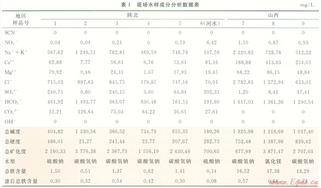 將現(xiàn)場所取回的2個(gè)區(qū)塊的8個(gè)水樣和1個(gè)壓裂液配水樣品進(jìn)行常規(guī)水質(zhì)分析[5],同時(shí)進(jìn)行了SCN-[6]NO3-[7]的檢測。實(shí)驗(yàn)結(jié)果如表l所示。