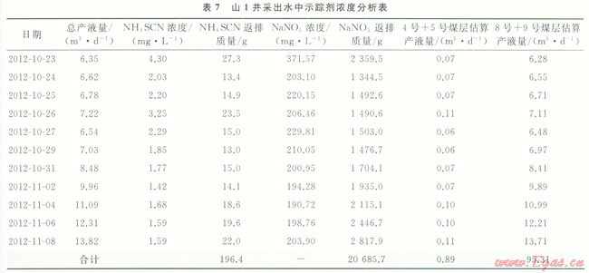 20125月對山12個(gè)層進(jìn)行了壓裂施工,8+9號煤層注入壓裂液975.6m3,加入NaNO3 500kg,示蹤劑在單層壓裂液中的平均濃度約為510mgL;4+5號煤層注入壓裂液1003.5m3,NH4SCN用量500kg,示蹤劑在單層壓裂液中的平均濃度約為500mgL。施工完成后,關(guān)井?dāng)U散壓力。油嘴控制排液,無液體返出。同年1017日進(jìn)行排采,1023日開始對采出液進(jìn)行采樣分析,17d內(nèi)取了11個(gè)樣,按照前面實(shí)驗(yàn)室分析方法分析SCNNO3-(除鐵,扣減SCN吸光度的方法進(jìn)行修正),采出水中各種示蹤劑的含量如表7數(shù)據(jù)所示。