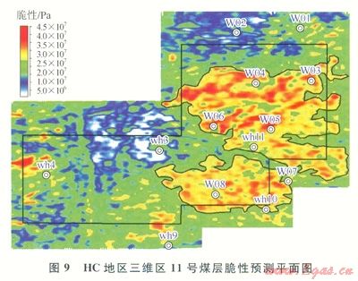 在沿11號煤層提取的脆性預(yù)測平面圖(9)上可以看到:黑色多邊形圈中的紅色區(qū)域指示煤層脆性比較高,主要位于工區(qū)中東部,壓裂時易產(chǎn)生裂縫;而西部地區(qū)巖石的脆性較低,不易于壓裂。