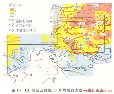 根據(jù)開發(fā)成本及鉆井需求,針對11號煤層,把埋深小于1200m作為評價有利區(qū)的約束條件,結(jié)合其他多種信息制定如表1的評價標(biāo)準(zhǔn),將各方面因素有利區(qū)域疊合得到甜點區(qū)范圍(10紅色多邊形圈中的區(qū)域),圖中紫色加粗線為1200m埋深線,顏色為厚度,黃色和紅色為煤層厚度大于3m的區(qū)域。在這里,煤層埋深是首要因素,在煤層氣開發(fā)中起著“一票否決制”的作用,煤層若埋藏過深,鑒于開采工藝和開發(fā)成本即使預(yù)測含氣量高、滲透性好、脆性好也不予考慮。從圖10可以看到該層甜點區(qū)面積達(dá)到21.64km2,根據(jù)預(yù)測結(jié)果在甜點區(qū)內(nèi)部署的數(shù)十口開發(fā)井中,目前有2口井進入排采階段,排采狀況良好,其中yz1井日產(chǎn)氣量達(dá)到1600m3yz2日產(chǎn)氣量達(dá)到2000m3,而同期位于甜點區(qū)外的井日產(chǎn)氣量僅為200m3。