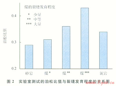 Gregory發(fā)現(xiàn)巖石的裂縫引起縱橫波速度比和泊松比的增大[7]。Ramos and Davis實驗測試表明新墨西哥州Cedar Hill Field的煤層樣品泊松比和裂縫密度有關(guān)[8-9](2),可以看出煤層的泊松比隨著裂縫密度由低到高增加了30%。當(dāng)然實驗室測量結(jié)果不等同于現(xiàn)場煤層的割理情況,但是圖2所揭示的泊松比和煤層裂縫密度之間的關(guān)系是可靠的,可用于現(xiàn)場煤層泊松比和裂縫密度的預(yù)測,即煤層的泊松比和裂縫密度為正相關(guān)。在AVO理論中,假定vp/vs2,偽泊松比反射率(Ds/s)等于截距與梯度之和的一半[9],反映的是反射界面兩側(cè)介質(zhì)的泊松比差值,與泊松比是呈正相關(guān)的。因此,AVO反演得到的偽泊松比反射系數(shù)屬性可以用于指示裂縫發(fā)育特征,偽泊松比值大,則裂縫發(fā)育程度高。