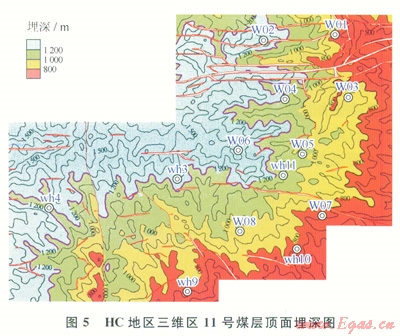 HC地區(qū)地處鄂爾多斯盆地東南邊緣的渭北沖斷褶皺帶上,受多期構(gòu)造控制或影響,使區(qū)內(nèi)含煤構(gòu)造呈現(xiàn)北東—南西向展布,總體構(gòu)造形態(tài)為北西傾向的單斜構(gòu)造。該區(qū)已實施了滿覆蓋面積100km2的三維地震勘探,主力煤層為5號煤層和ll號煤層,5號煤層厚度較小,但區(qū)域上分布相對較穩(wěn)定,厚度一般分布在19m之間,單層厚變化較大,W085號單層厚度可達(dá)9.9m;11號煤層在三維區(qū)內(nèi)厚度分布不穩(wěn)定,厚度相對較薄,最大單層厚度在10m左右。