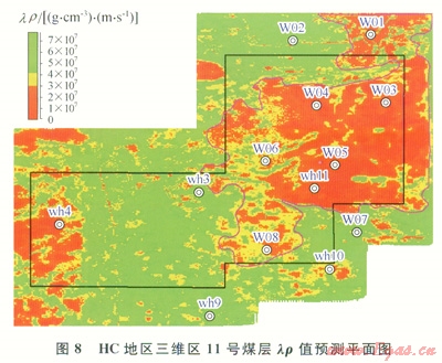 如前所述,lr值與含氣量存在負(fù)相關(guān)。在11號煤層lr值平面圖(8)上紅色代表lr值大,對應(yīng)含氣量高,因而工區(qū)中東部粉色多邊形范圍為11號煤層含氣量高的區(qū)域(這里不考慮埋深大于1200m的西部區(qū)域),為該層煤層氣開采首選區(qū)域。
