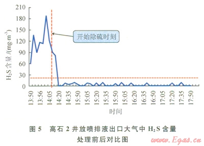含硫井排出液自動(dòng)實(shí)時(shí)處理流程(4)]二藝技術(shù)目前已經(jīng)在川渝地區(qū)多口井開(kāi)展應(yīng)用,效果顯著(5),如高石2井在排液期間,采用該技術(shù)對(duì)井筒產(chǎn)出液進(jìn)行處理前,放噴出口大氣環(huán)境中H2S含量主要維持在115173mgm3范圍內(nèi),而應(yīng)用該技術(shù)后,放噴出口大氣環(huán)境中H2S含量降低到8.65mgm3以?xún)?nèi),可以滿(mǎn)足井場(chǎng)人員連續(xù)作業(yè)的要求。