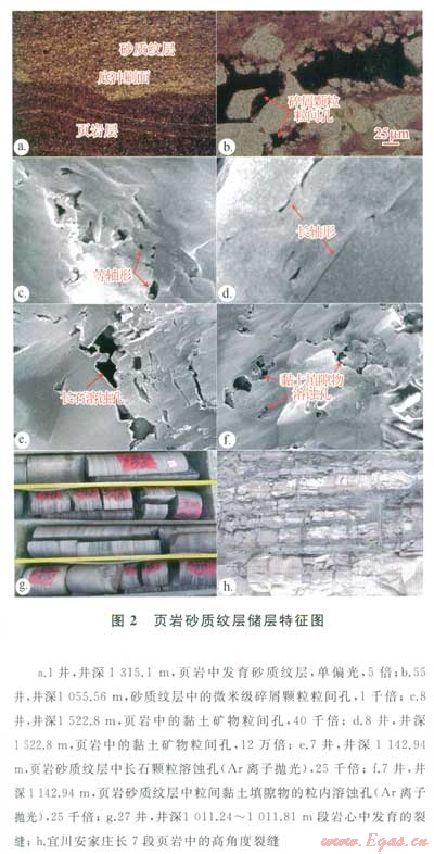 砂質(zhì)紋層廣泛發(fā)育原生粒間孔和次生溶蝕孔。原生粒間孔主要是碎屑顆粒粒間孔與黏土礦物粒間孔。碎屑顆粒粒間孔在砂質(zhì)紋層中極為常見,該類孔隙的孔隙形態(tài)多呈不規(guī)則的多邊形,直徑以微米級(jí)至幾十微米為主(大孔級(jí))(圖2-a、2-b)。黏土礦物粒間孔是黏土礦物(主要是伊利石與綠泥石)圄成的孔隙空間,掃描電鏡下常見長(zhǎng)軸形和等軸形2種形態(tài)(圖2-c、2-d)。長(zhǎng)軸形由于壓實(shí)的影響而呈“縫”狀,其孔徑大小可達(dá)數(shù)十納米(中孔級(jí)),一般沿黏土礦物層理呈定向分布;等軸形是黏土礦物顆粒在強(qiáng)水動(dòng)力環(huán)境堆積而成的粒間孔,或者是黏土絮凝物在靜水環(huán)境殘留下來的殘余孔(一般為大孔級(jí)),分布較雜亂。次生溶蝕孔一般發(fā)育在長(zhǎng)石及碎屑顆粒的粒間填隙物內(nèi)(圖2-c、2-f),包括粒間孔、粒內(nèi)孔和鑄??祝粤ig孔為主。粒間孔形態(tài)各異,常見港灣狀溶蝕邊緣,直徑以數(shù)十至數(shù)百納米為主(中孔級(jí));粒內(nèi)孔多納米級(jí)(小孔級(jí));鑄模孔包括顆粒間易溶物鑄模和顆粒鑄模,孔徑變化較大。砂質(zhì)紋層還發(fā)育構(gòu)造裂縫,裂縫面比較粗糙,以高角度縫為主,產(chǎn)狀不穩(wěn)定(圖2-g、2-h)。